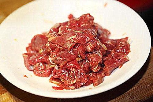 3. 将腌制好的牛肉放入搅拌机中,加入适量的淀粉,搅拌均匀。